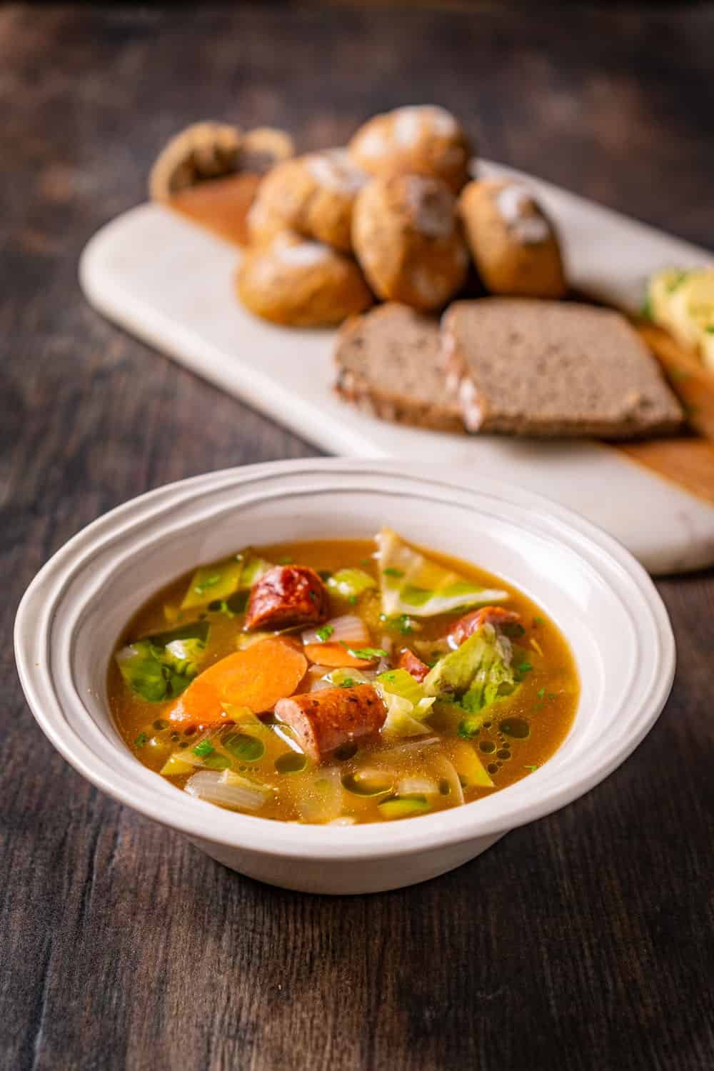 Kiełbasa is often served with fried onions or sauerkraut, in pea or cabbage soups, or added to with beans to casseroles or stews.